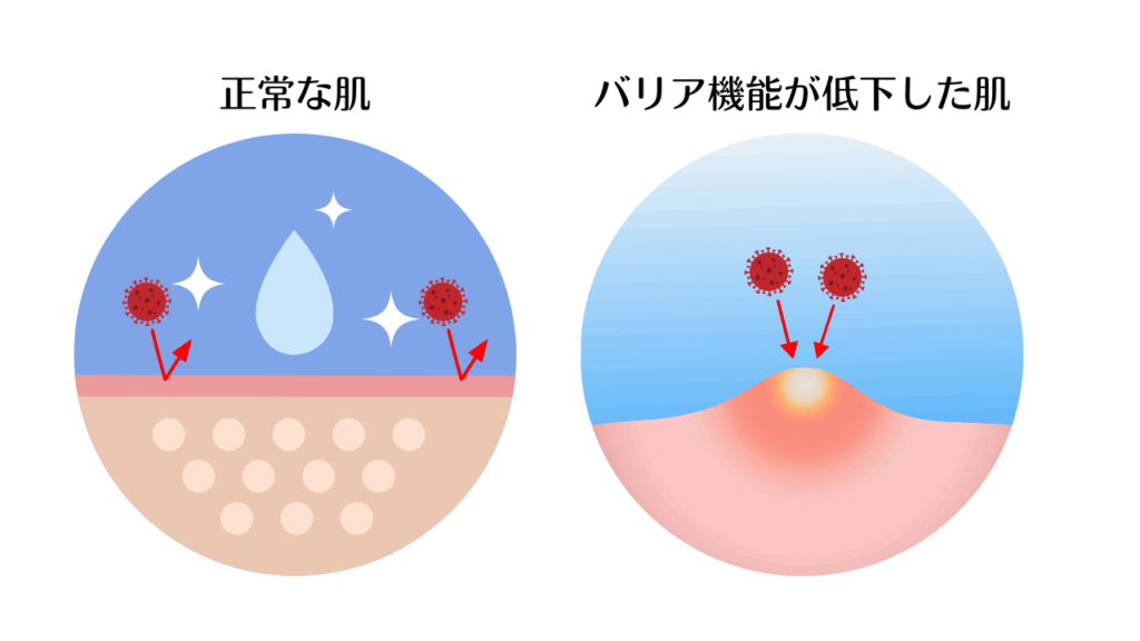 しかし、乾燥や湿疹があると皮膚のバリア機能が低下するため、そこからアレルゲンなどの異物が体内に侵入することができます。