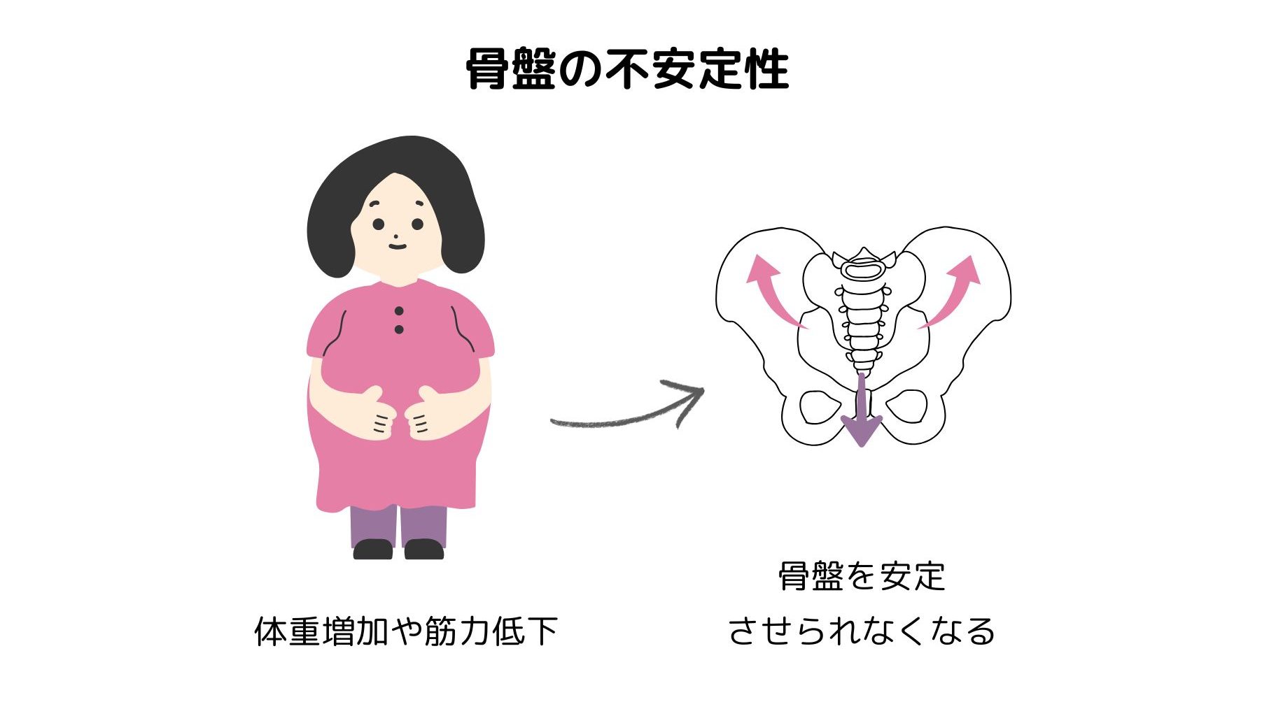 筋力低下や体重増加により骨盤をうまく安定させられず、仙腸関節への負担が強くなり、痛みが生じることがあります。