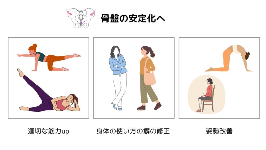 仙腸関節は、お尻やお腹の筋肉・骨盤底筋群などがバランスよく働くことで安定するため、
